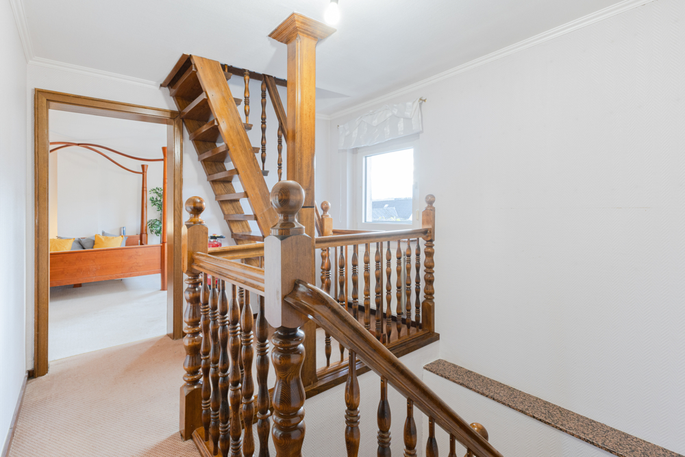 Durch die zwei Hauseingänge und die beiden Treppenhäuser bietet das Gebäude eine hervorragende Voraussetzung für ein Ein- oder Zweifamilienhaus. Im Obergeschoss wurde ein großzügiger Anbau geschaffen, der das Herzstück der Immobilie bildet: ein lichtdurchflutetes Studio mit Kaminecke und großer Fensterfront, die Zugang zum Balkon ermöglicht. Ergänzend stehen auf dieser Etage zwei weitere Zimmer sowie ein Bad mit Waschtisch, Badewanne und Dusche zur Verfügung. Über eine Raumspartreppe gelangen Sie vom ersten Obergeschoss ins Dachgeschoss, das ebenso wie der Keller zusätzliche Abstellfläche bietet.