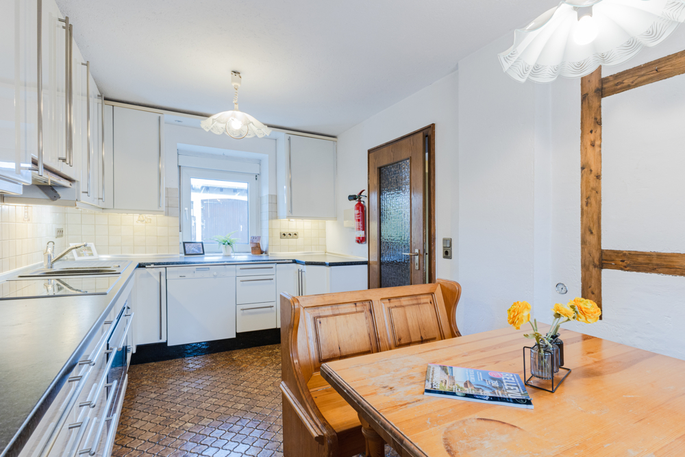 Im Erdgeschoss befinden sich die geräumige Küche, ein Wohn-/ Esszimmer, ein Gäste-WC sowie ein Schlafzimmer. Zusätzlich liegt hier ein Duschbad, das nach einem Rohrbruch noch nicht wiederhergestellt wurde, eine ideale Gelegenheit für eine moderne Neugestaltung. Ergänzt wird diese Ebene durch drei kleinere Räume, die derzeit als Heizungsraum, Abstellfläche und Waschküche genutzt werden. Ein weiteres Zimmer, vom Innenhof aus zugänglich, diente zuletzt als Büro – perfekt für Selbstständige, die Wohnen und Arbeiten trennen möchten!