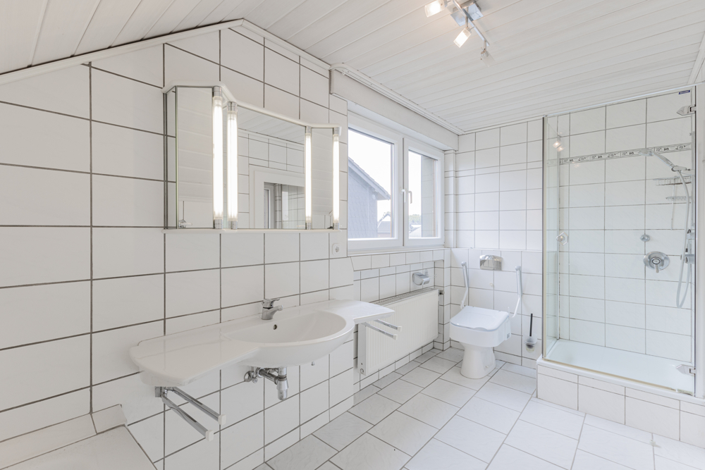 Vom tageslichthellen Eingangsbereich, gelangen Sie über vier Stufen in die zentrale Diele des Erdgeschosses. Das ehemalige Gäste-WC auf der linken Seite, wurde erst vor kurzem zu einem modernen Duschbad erweitert. Direkt daneben punktet die separate Küche mit einem geräumigen Zuschnitt und direkten Zugang zum angrenzenden Wohn-Esszimmer, mit viel Platz für Sie und Ihre Lieben. Große Panoramafenster gewähren von hier einen wunderbaren Blick auf die teilüberdachte Süd-West-Terrasse und den dahinter liegenden, hübsch angelegten Garten. Der zum Wohnzimmer hin offene Kaminraum weckt die Vorfreude auf behagliche Stunden vor dem prasselnden Feuer.