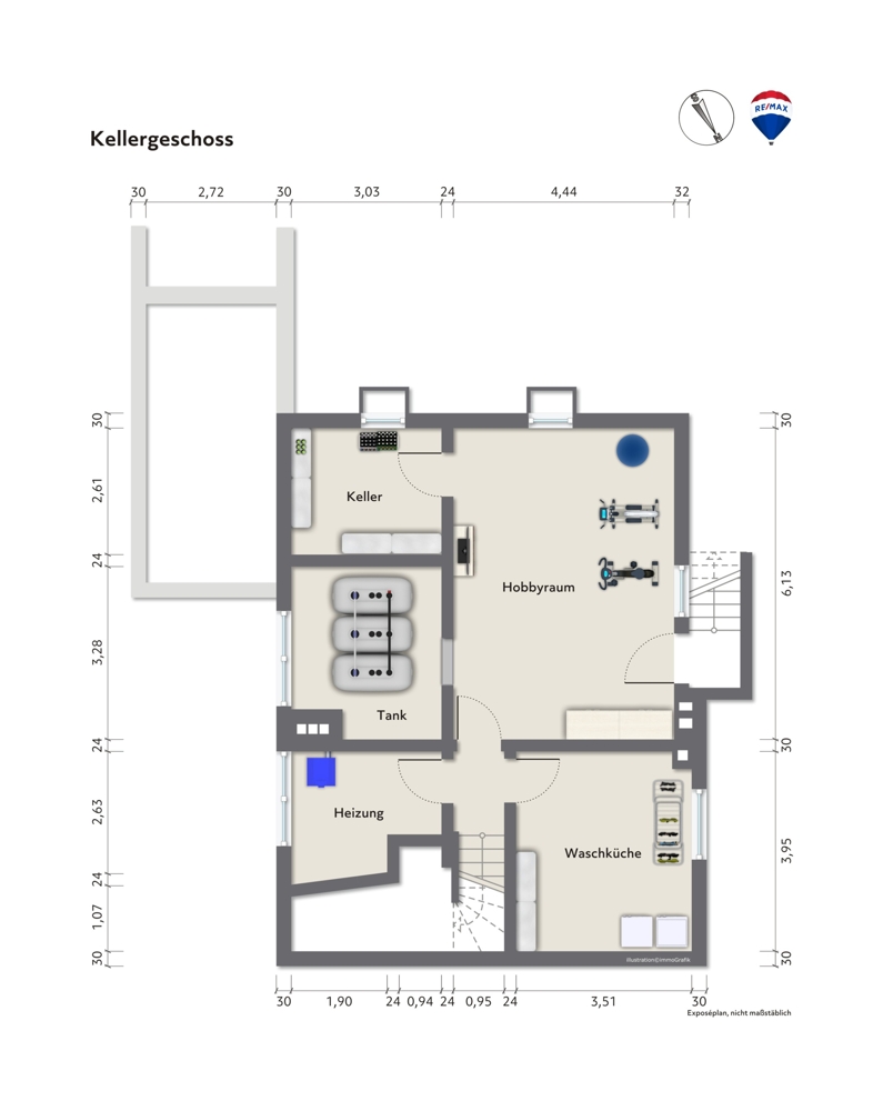 Im Keller stehen Ihnen Räume für die Heizung, für das Lagern von Lebensmitteln, sowie eine praktische Waschküche zur Verfügung. Als Highlight öffnen Sie auf dieser Ebene außerdem die Tür zu einem gemütlichen Party- und Wellnessraum. Eine urige Theke aus den späten 60er Jahren und eine Sauna mit Dusche warten darauf, von Ihnen wieder instandgesetzt zu werden.