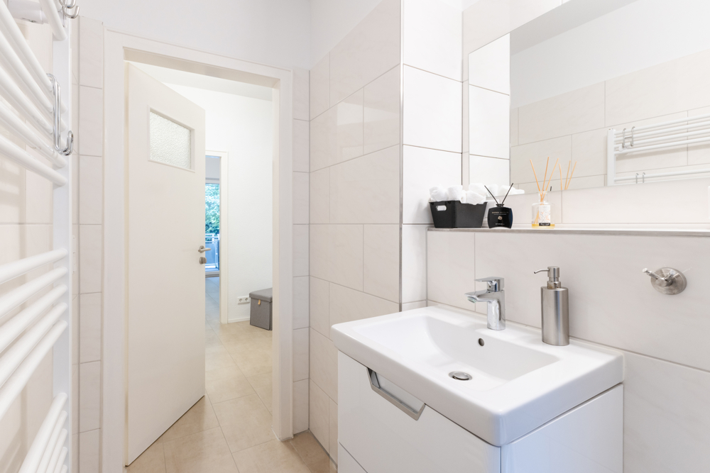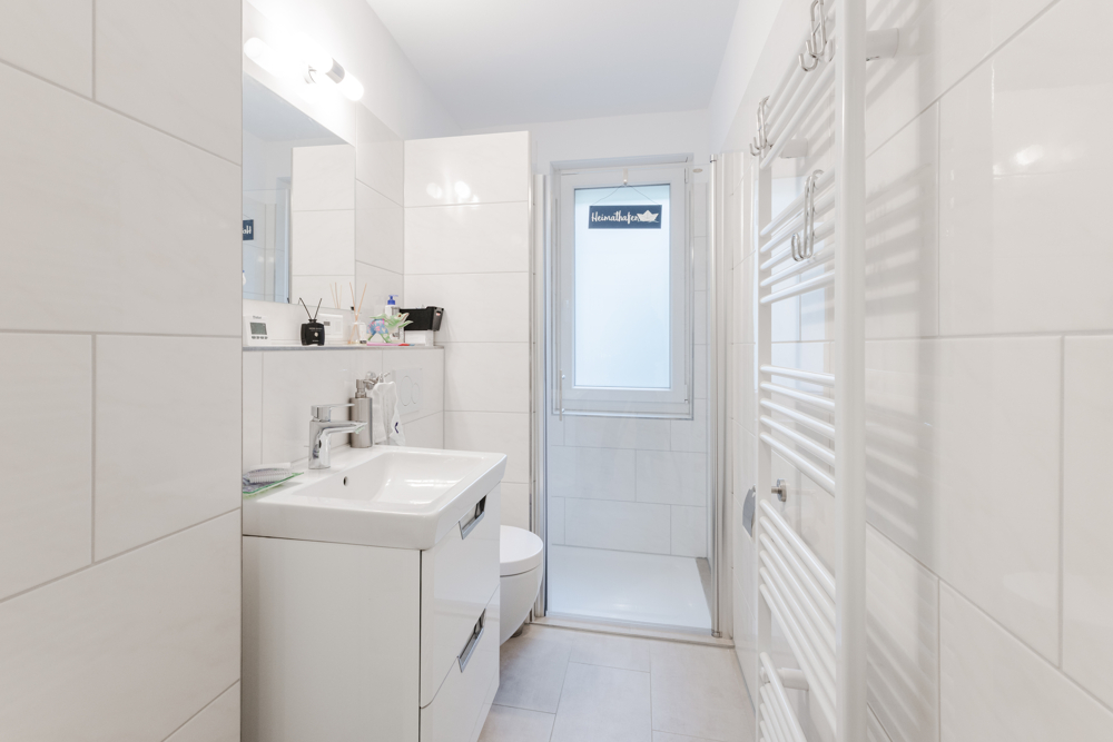 Das Duschbad mit Fenster ist mit weißem Sanitär, weißen Wandfliesen und einem Handtuchwärmer ausgestattet.