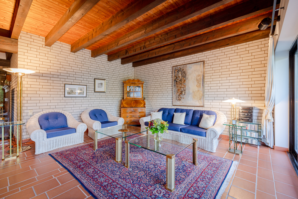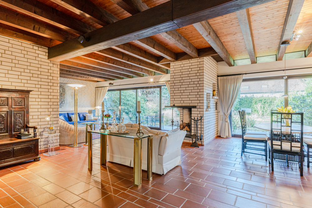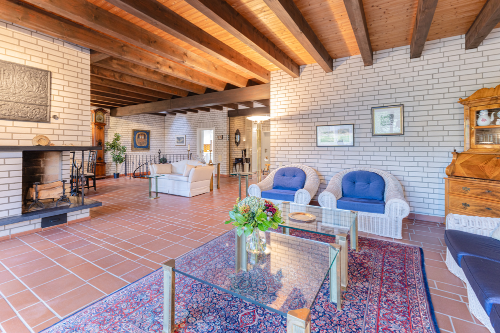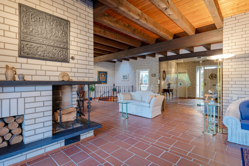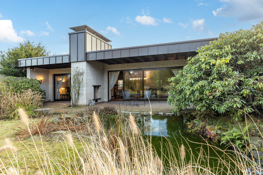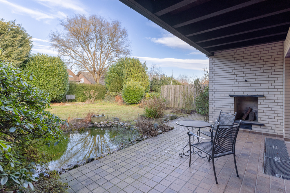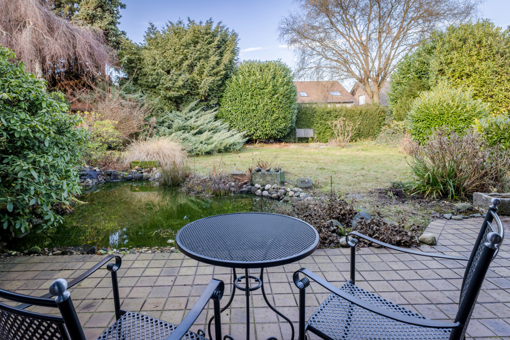 Das Herzstück des Anwesens ist der helle, großzügige Wohn-Essbereich, der sich durch großzügige Fensterfronten auf die Terrasse öffnet und einen herrlichen Blick auf den liebevoll gestalteten Garten mit Teich und Outdoor-Kamin ermöglicht – perfekt für entspannte Stunden unter freiem Himmel.