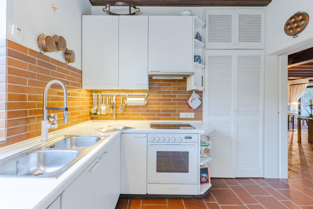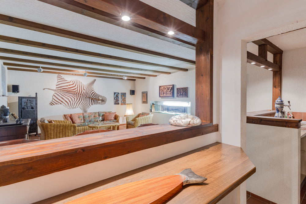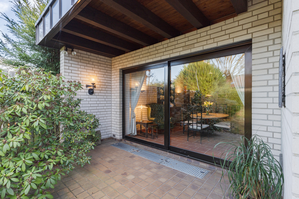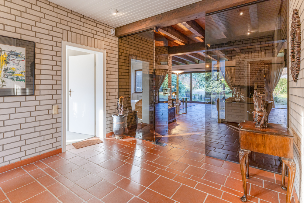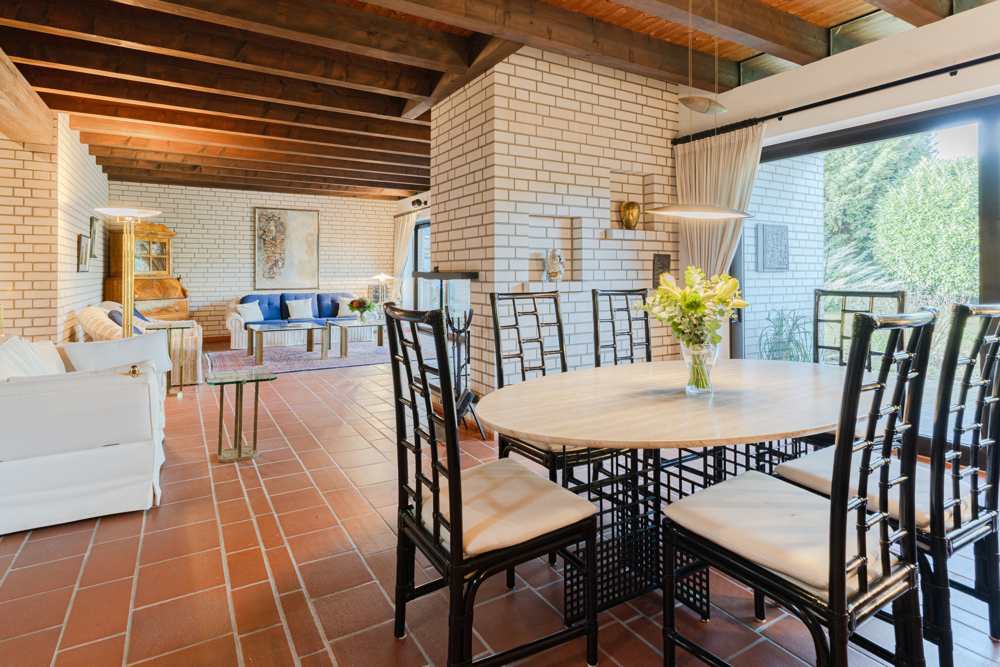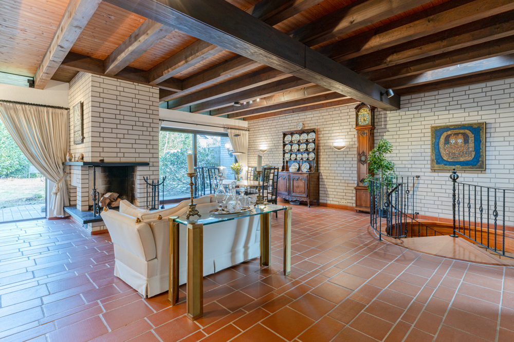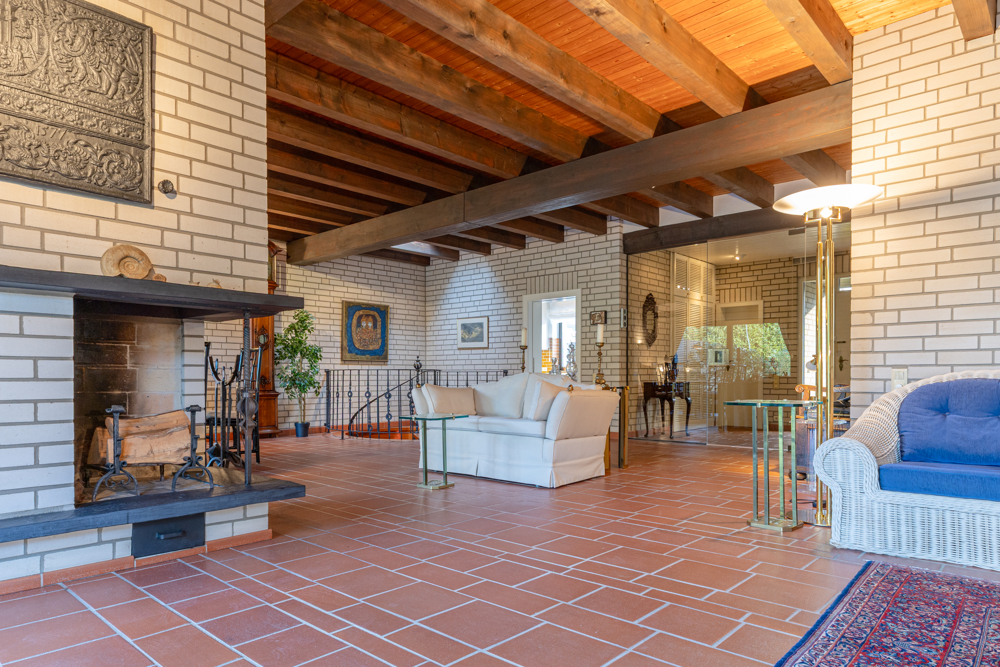 Das Herzstück des Anwesens ist der helle, großzügige Wohn-Essbereich, der sich durch großzügige Fensterfronten auf die Terrasse öffnet und einen herrlichen Blick auf den liebevoll gestalteten Garten mit Teich und Outdoor-Kamin ermöglicht – perfekt für entspannte Stunden unter freiem Himmel.