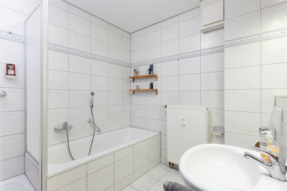 Angrenzend an den Wohnbereich befindet sich die separate Küche (Eigentum des aktuellen Mieters). Auf der gegenüberliegenden Seite liegt das Schlafzimmer. Der Flur bietet Platz für Stauraum und führt Sie in das innenliegende Bad mit Dusche und Badewanne.