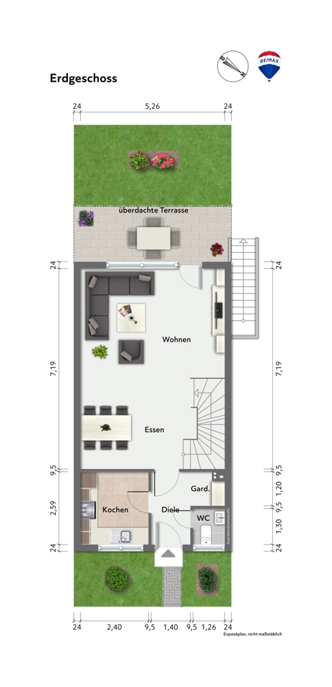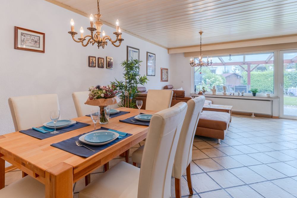 Das Herzstück des Hauses bildet der sonnige Wohnbereich mit direktem Zugang zur Terrasse und dem grünen Garten, in dem Kinder spielen und Eltern entspannen können. Hier blüht das Familienleben auf!