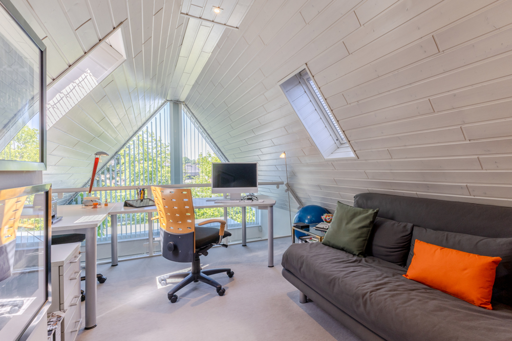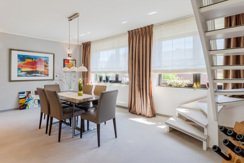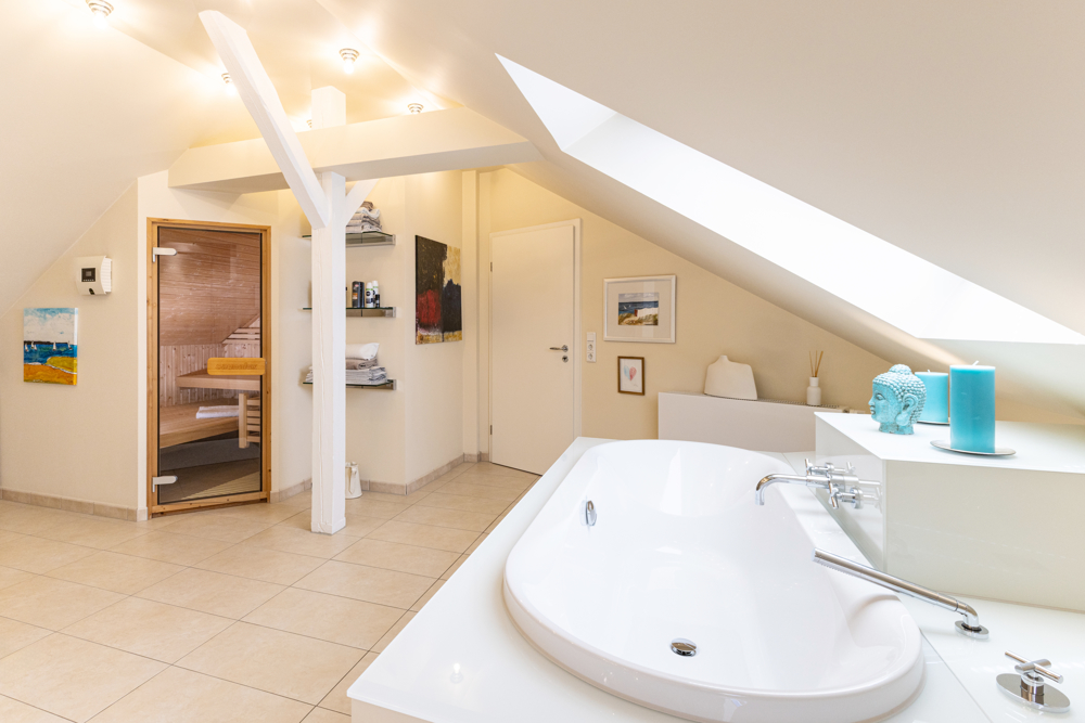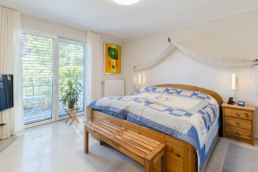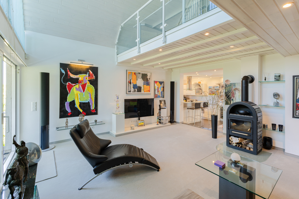 Alarmanlage, Klimageräte, eine Sauna, eine elektrische Markise auf dem Balkon in der oberen Maisonettewohnung und zwei Einzelgaragen gehören zu dieser außergewöhnlichen Immobilie dazu.