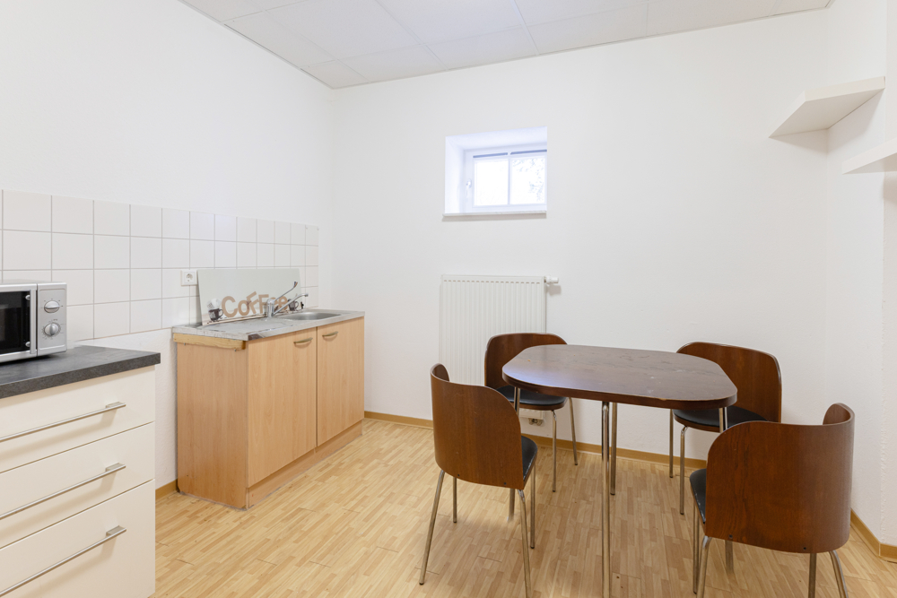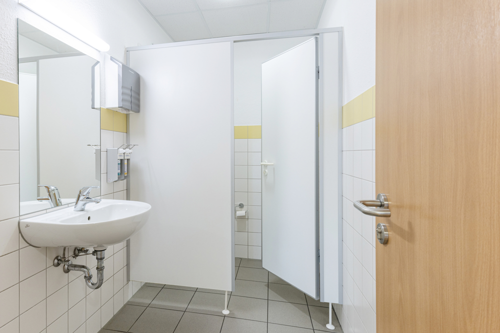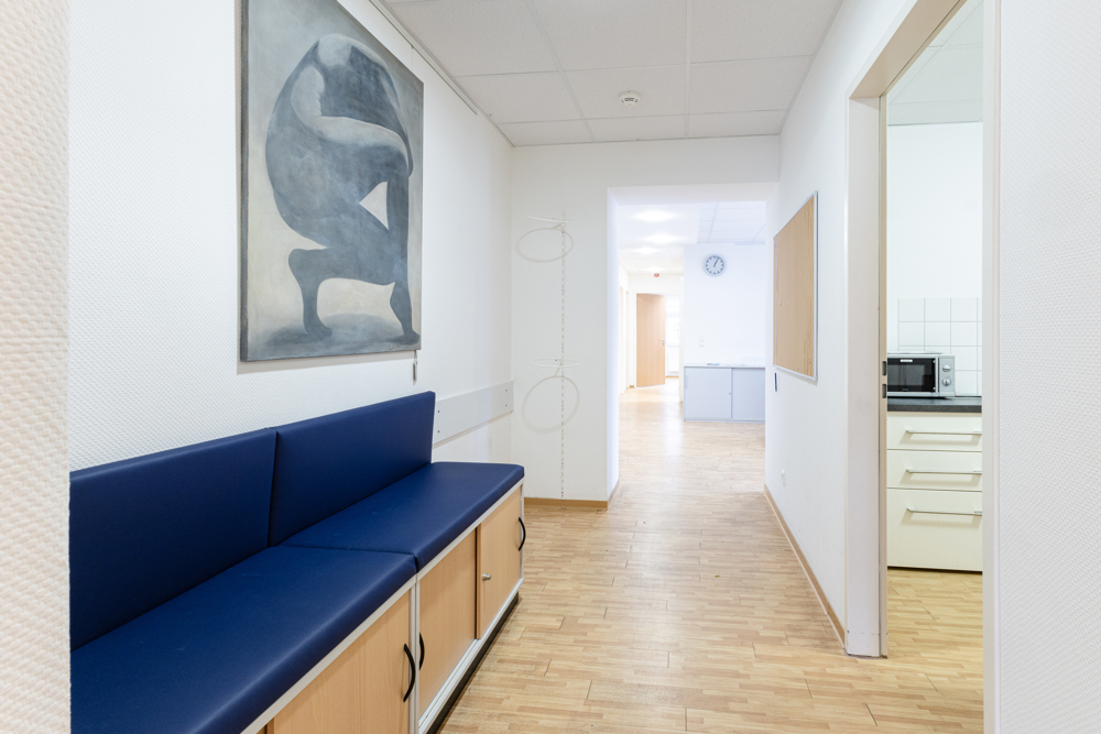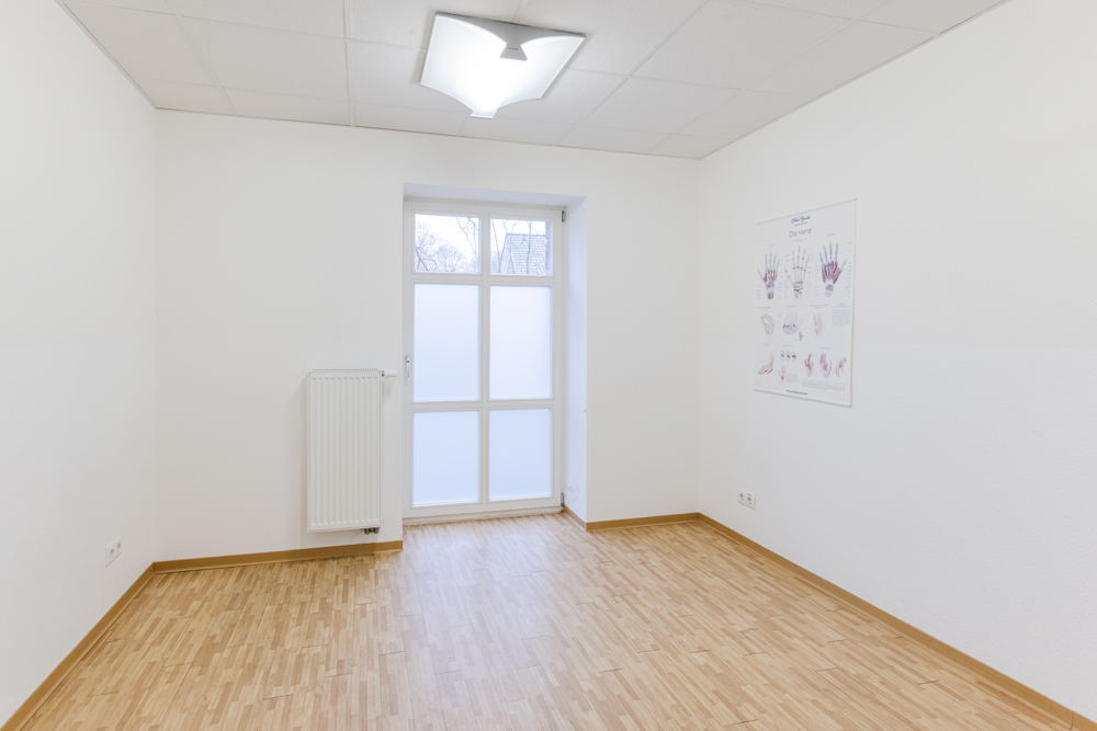 Über einen seitlich gelegenen Eingang gelangt man in die großzügig geschnittenen Räumlichkeiten. Die Einheit verfügt über insgesamt vier Behandlungszimmer bzw. Büroräume, einen Geräteraum, eine Teeküche, zwei Umkleidekabinen mit Duschen sowie zwei Gäste-WCs.