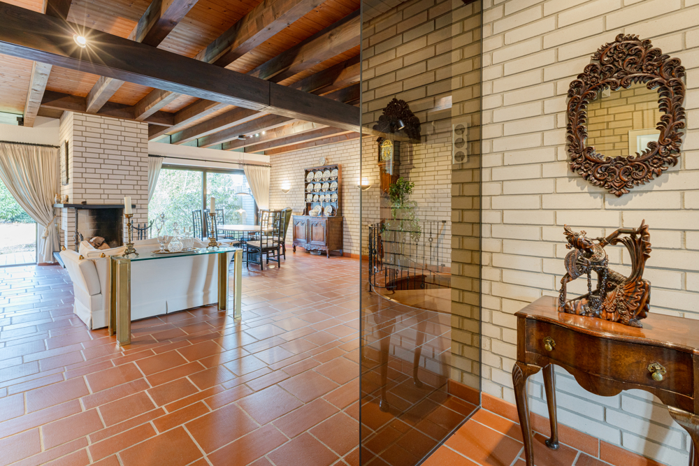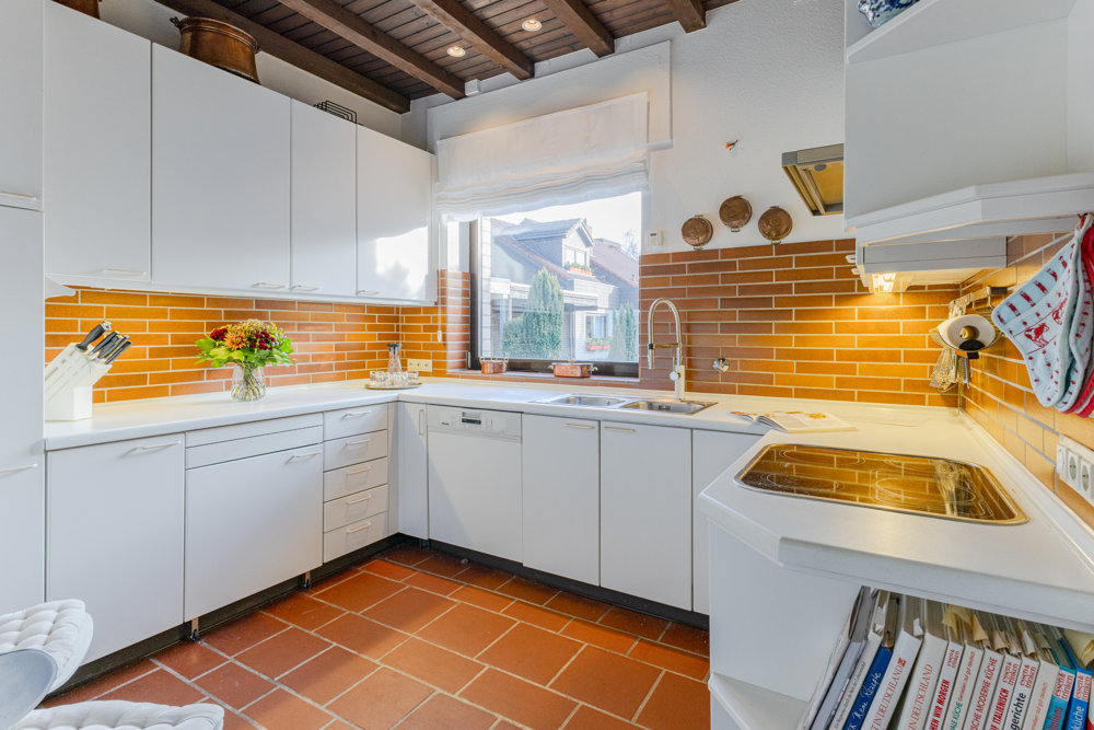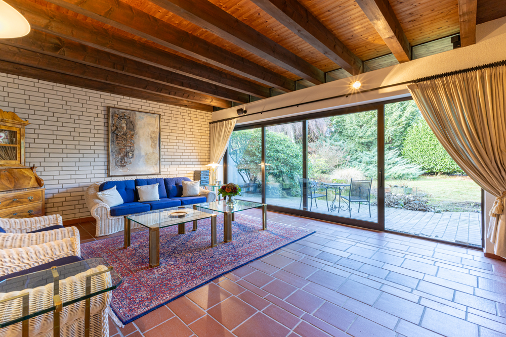 Das Herzstück des Anwesens ist der helle, großzügige Wohn-Essbereich, der sich durch großzügige Fensterfronten auf die Terrasse öffnet und einen herrlichen Blick auf den liebevoll gestalteten Garten mit Teich und Outdoor-Kamin ermöglicht – perfekt für entspannte Stunden unter freiem Himmel.