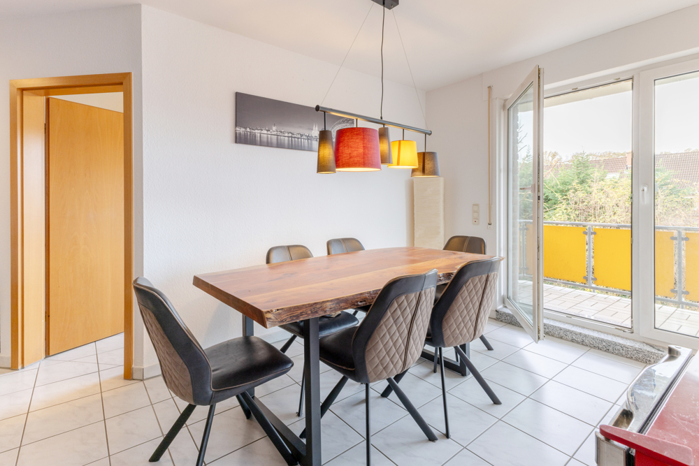 Der großzügige, offen gestaltete Wohn- und Essbereich bildet das Herzstück der Wohnung. Bodentiefe Fenster sorgen für viel Tageslicht und eine freundliche Atmosphäre. Von diesem Raum aus gelangen Sie auf den Balkon, der einen schönen Blick in den gemeinschaftlich nutzbaren Garten bietet.